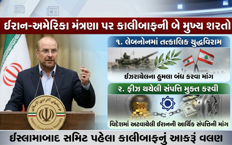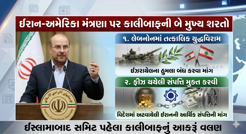ઈરાન અને અમેરિકા વચ્ચે ઈસ્લામાબાદમાં યોજાનારી મહત્વપૂર્ણ શાંતિ મંત્રણા પહેલા ઈરાને આકરૂ વલણ અપનાવ્યું છે. ઈરાની સંસદના સ્પીકર મોહમ્મદ બાગેર કાલીબાફે સ્પષ્ટ કર્યું છે કે જ્યાં સુધી બે મુખ્ય શરતો પૂરી ન થાય ત્યાં સુધી મંત્રણા આગળ વધશે નહીં.