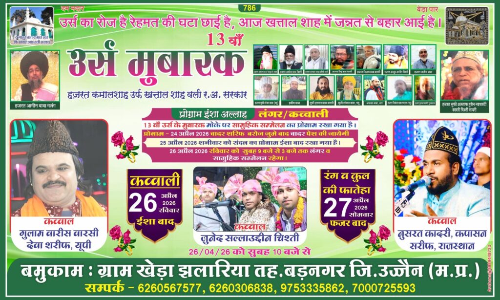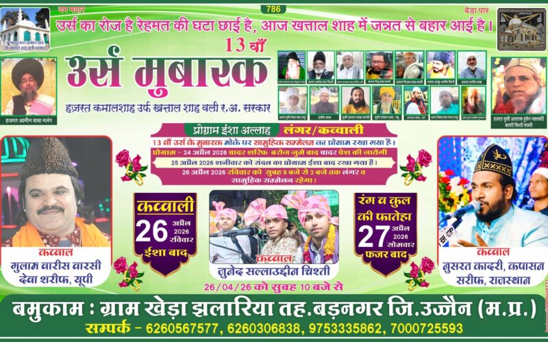 ઉજ્જૈન જિલ્લાના બડનગર તાલુકાના ગ્રામ ખેડા ઝલારિયા ખાતે હઝરત કમાલશાહ વલી (રહમતુલ્લાહ અલેહ) સરકારનો 13મો વાર્ષિક ઉર્સ મુબારક આ એપ્રિલ માસમાં ભવ્ય અને ધાર્મિક ભાવનાથી ઉજવાવાનો છે. આ પવિત્ર અવસર માત્ર એક ધાર્મિક ઉજવણી જ નહીં પરંતુ આસ્થા, ભાઈચારો અને માનવતાનો સંદેશ આપતો આધ્યાત્મિક મહોત્સવ બની રહે છે.ત્રણ દિવસ સુધી ચાલનારા આ ઉર્સ મહોત્સવ દરમિયાન વિવિધ ધાર્મિક કાર્યક્રમો યોજાશે, જેમાં દેશભરના શ્રદ્ધાળુઓ મોટી સંખ્યામાં હાજરી આપી દુઆ અને બરકત મેળવશે. ઉર્સ મહોત્સવની શરૂઆત 24 એપ્રિલે પવિત્ર ચાદર શરીફના જુલૂસ અને ચાદર પેશી સાથે થશે, જે ભક્તિ અને શ્રદ્ધાનો અનોખો નજારો સર્જશે. 25 એપ્રિલે ઈશાની નમાઝ બાદ સંદલ શરીફનો કાર્યક્રમ યોજાશે,