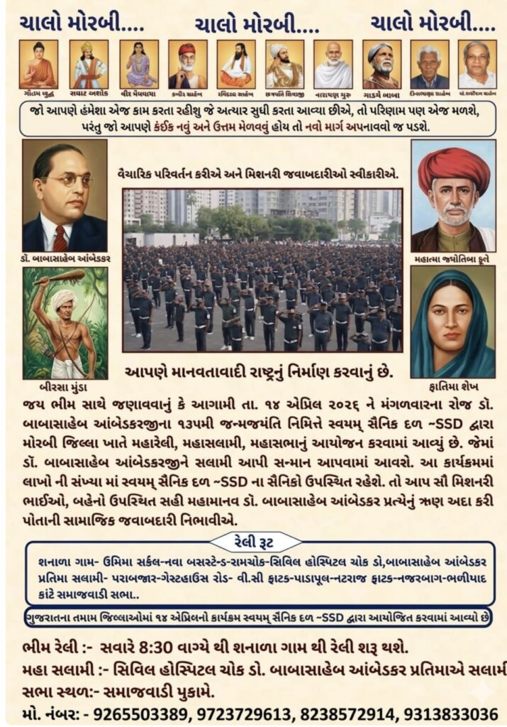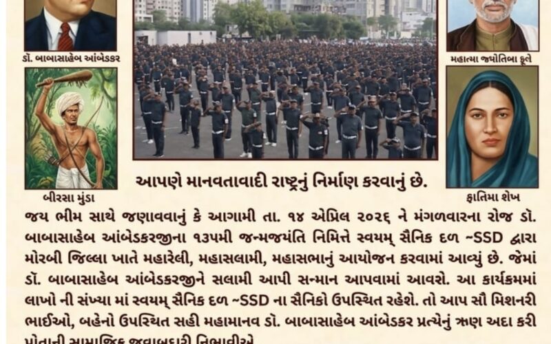 મોરબી: આગામી ૧૪ એપ્રિલ ૨૦૨૬ના રોજ બંધારણના ઘડવૈયા ડૉ. બાબાસાહેબ આંબેડકરની ૧૩૫મી જન્મજયંતિ નિમિત્તે મોરબી જિલ્લામાં સ્વયમ્ સૈનિક દળ (SSD) દ્વારા એક ભવ્ય કાર્યક્રમનું આયોજન કરવામાં આવ્યું છે. આ અવસરે મોરબીના રાજમાર્ગો પર મહારેલી, મહાસલામી અને મહાસભા યોજાશે, જેમાં લાખોની સંખ્યામાં સ્વયમ્ સૈનિકો જોડાશે.