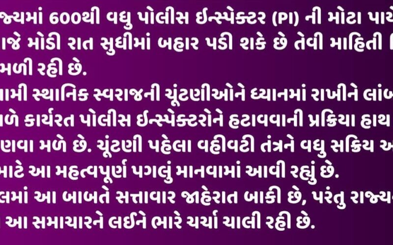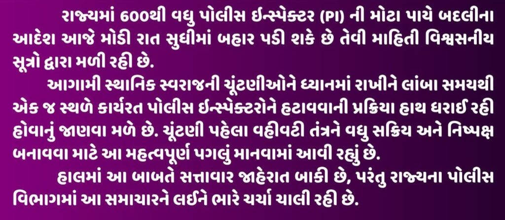 રાજ્યમાં 600થી વધુ પોલીસ ઇન્સ્પેક્ટર (PI)ની મોટા પાયે બદલીના આદેશો બહાર પડવાના સંકેતો વચ્ચે પ્રશાસન તંત્ર વધુ સક્રિય બનતું જોવા મળી રહ્યું છે. વિશ્વસનીય સૂત્રોના જણાવ્યા મુજબ, આ બદલીઓ માત્ર રૂટિન પ્રક્રિયા નહીં પરંતુ આવનારી સ્થાનિક સ્વરાજ્યની ચૂંટણીને ધ્યાનમાં રાખીને પણ લેવામાં આવી રહી છે.લાંબા સમયથી એક જ સ્થાને કાર્યરત પોલીસ અધિકારીઓની બદલી દ્વારા તંત્રમાં નવી ઉર્જા અને પારદર્શિતા લાવવા પ્રયાસ કરવામાં આવી રહ્યો છે. સમય મર્યાદા પૂર્ણ કરનાર અધિકારીઓને અન્ય જિલ્લામાં ફેરબદલી આપીને તંત્રને વધુ નિષ્પક્ષ અને પ્રભાવશાળી બનાવવાનું મુખ્ય ઉદ્દેશ માનવામાં આવે છે.ચૂંટણી પૂર્વે કાયદો અને વ્યવસ્થા વધુ મજબૂત રહે તે માટે આવા નિર્ણયો મહત્વપૂર્ણ સાબિત થાય છે. જિલ્લા ફેરબદલીના સંકેતો દર્શાવે છે કે રાજ્ય સરકાર અને વહીવટી તંત્ર સુચારુ અને નિષ્પક્ષ ચૂંટણી માટે પ્રતિબદ્ધ છે.